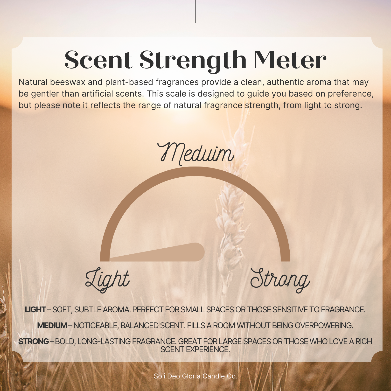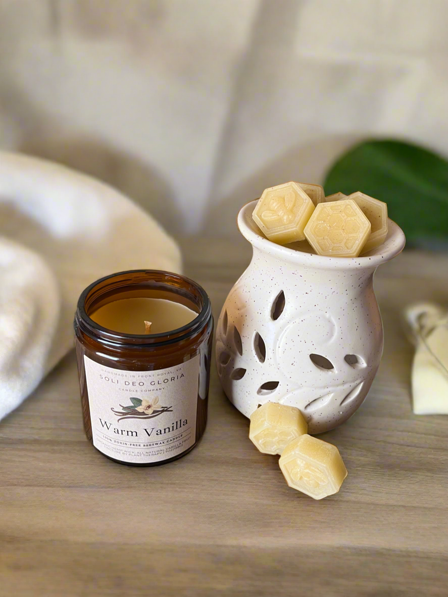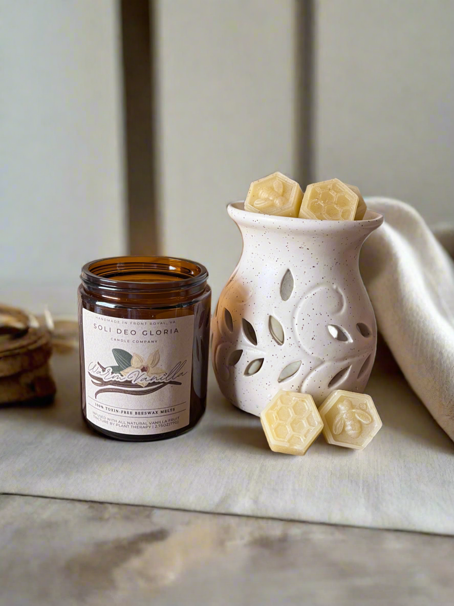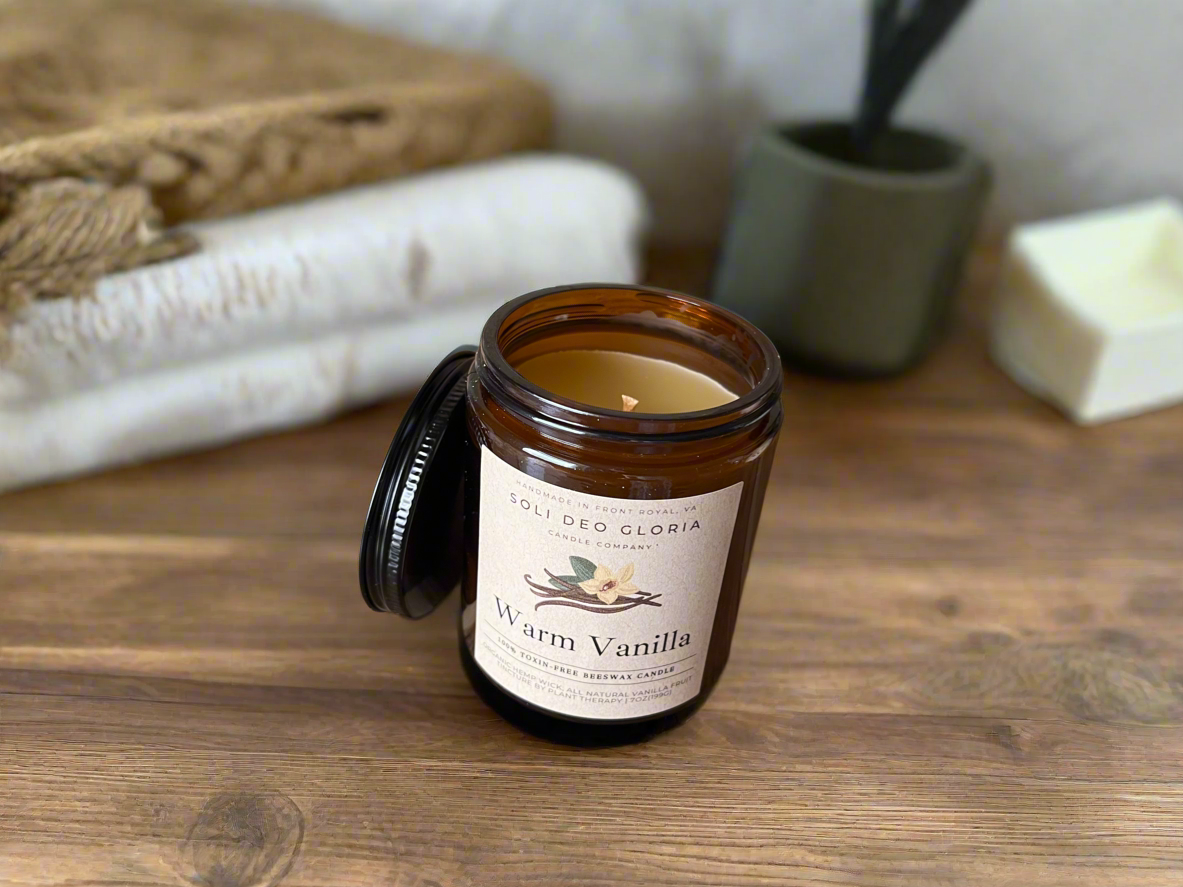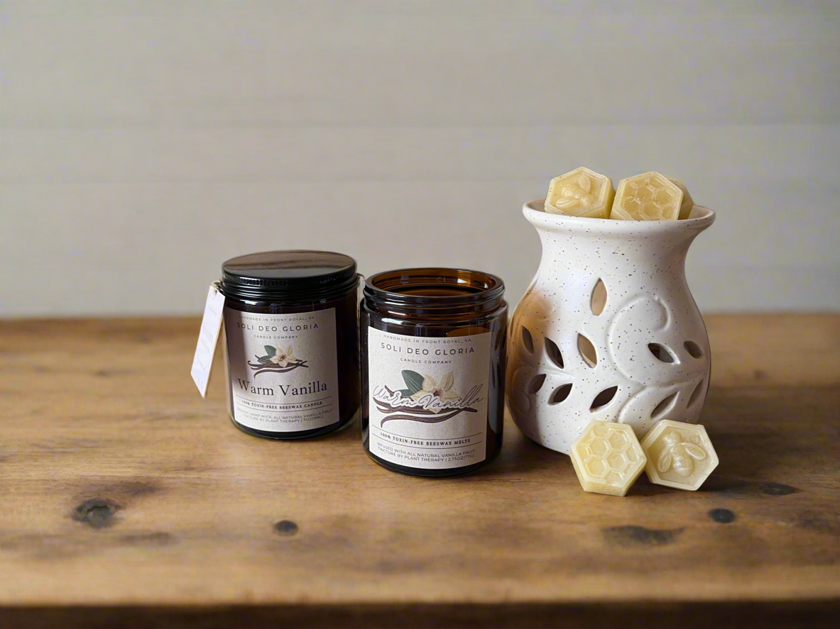 At Soli Deo Gloria Candle Company, we believe transparency is a form of integrity—what goes into our products should be clear, honest, and something we’re proud to share. That’s why we choose 100% pure beeswax and organic hemp wicks—natural, non-toxic materials that support clean burning and align with our commitment to safer, simpler ingredients. All oils and extracts are chosen for quality and third party tested for purity.