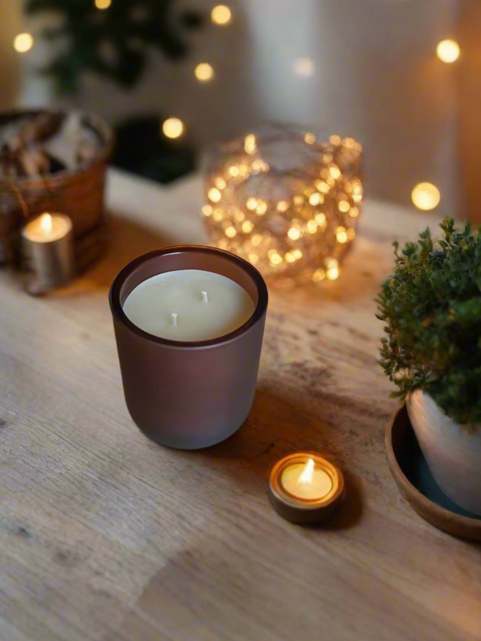 - Frosted Double Wick Amber Candle: 10oz & up to 50 hour burn time